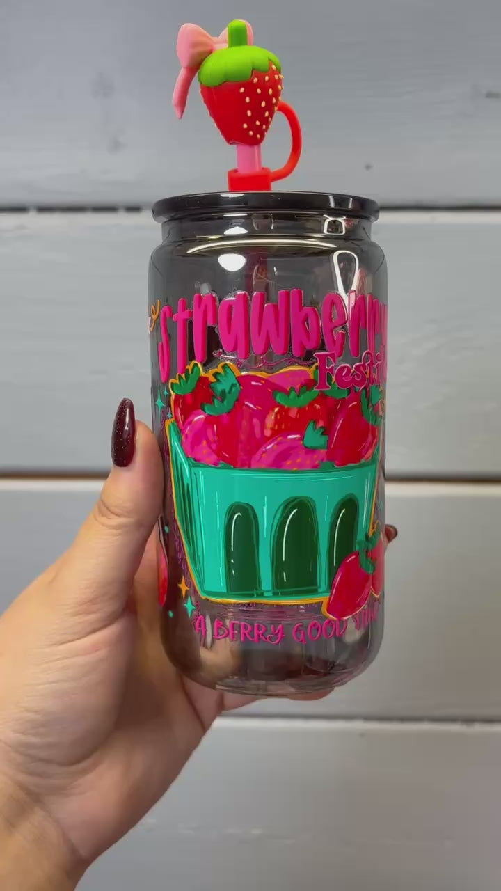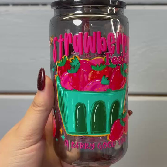 Shiny Black 16oz Glass Libby - Super Cute Strawberry Design