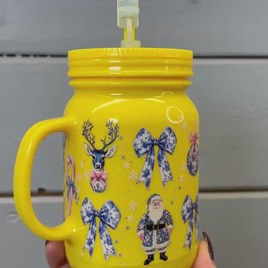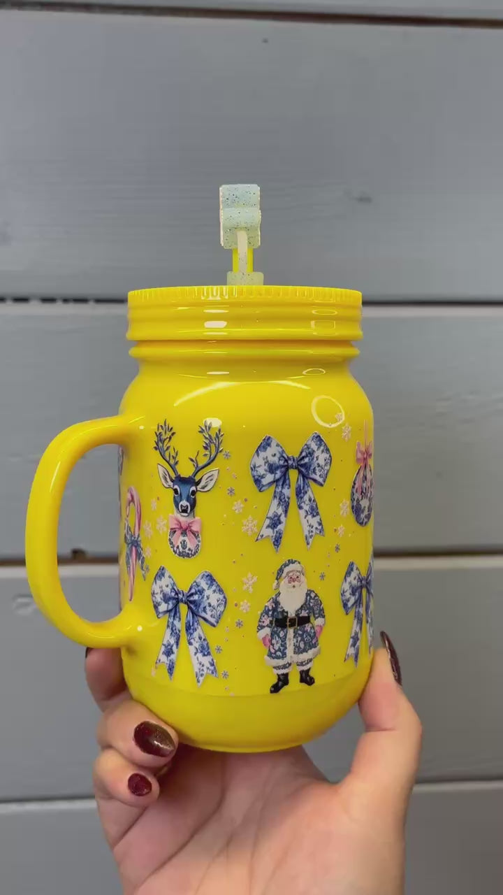 Yellow 20 oz Double Wall Plastic "Mason Jar" - Blue Christmas Design